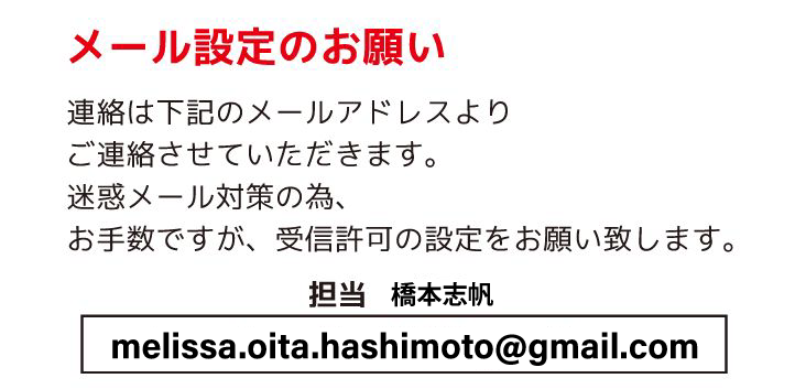 | お振込先 | 大分信用金庫 坂ノ市支店(店番009) 普通1097269 株)メリッサ ※お振込み名は申込みフォーム「お申込者名」でお振込みをお願い致します。 ※お振込みが法人名の場合はお申し込みフォームにご記入ください。 ※申し込みフォーム送信後、お振込の確認ができましたら、出店確定のメールをお送りいたしますのでご確認ください。 ※お振込後、1週間以内に返信いたします。1週間以上経ってもメールがない場合、恐れ入りますがご連絡下さい |